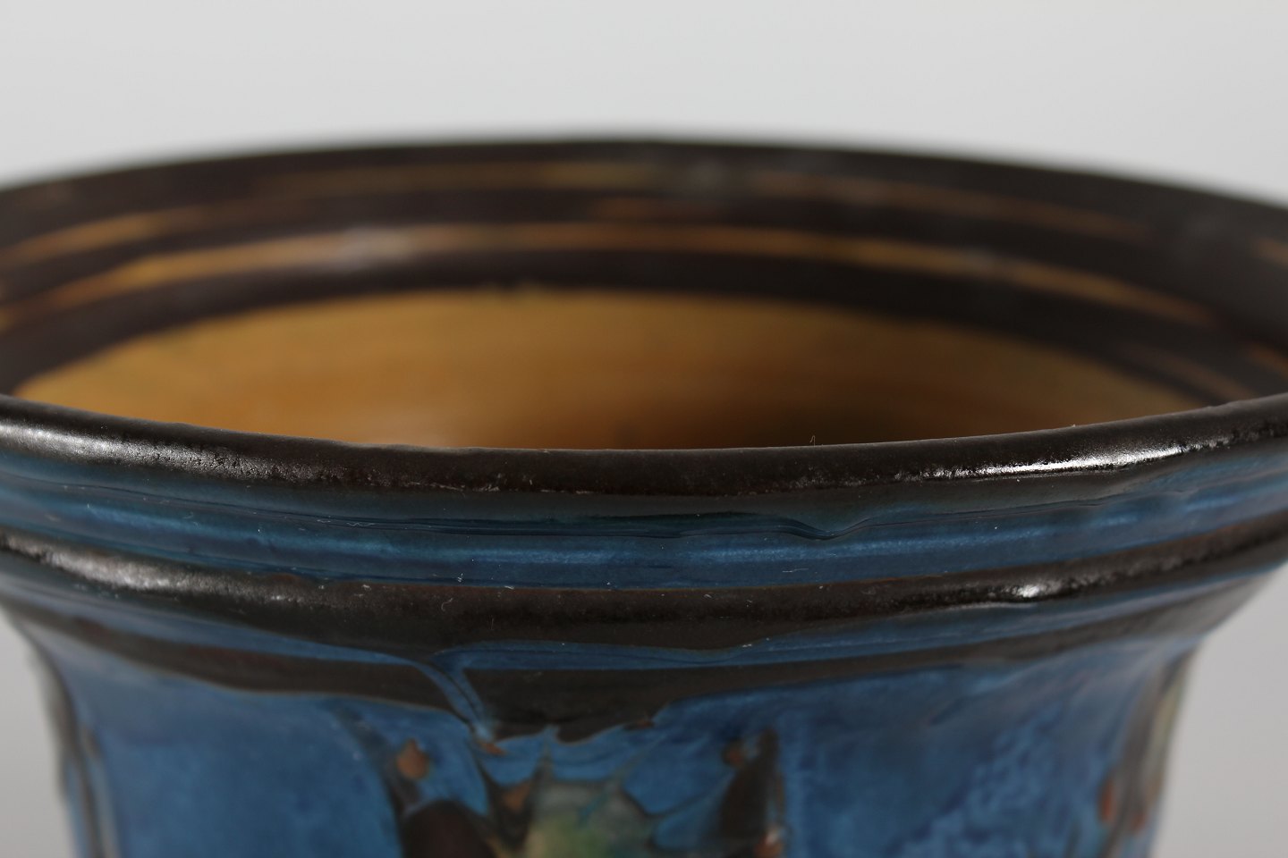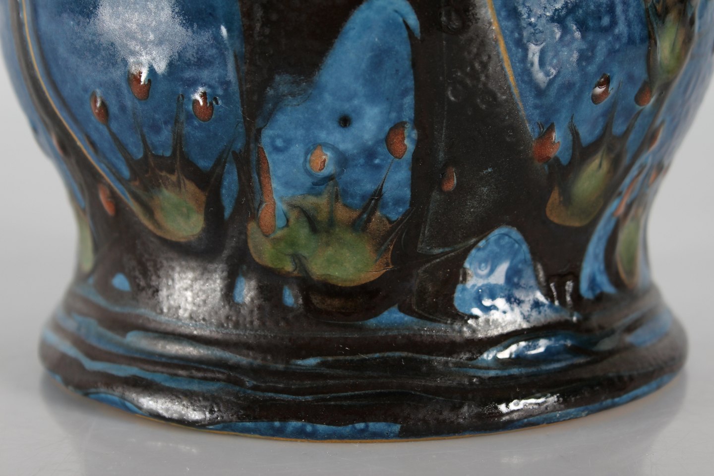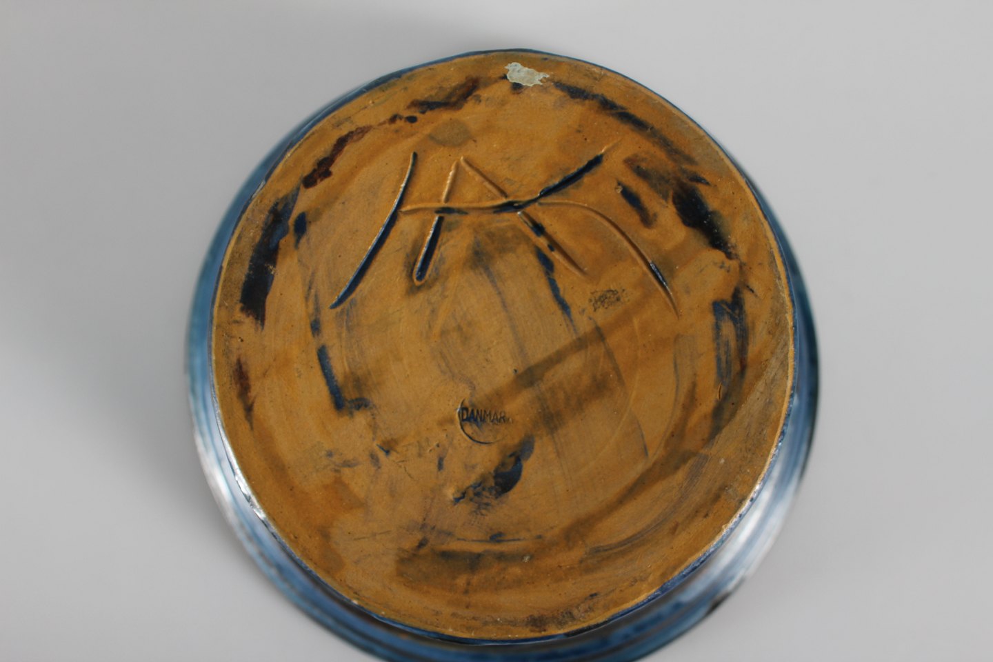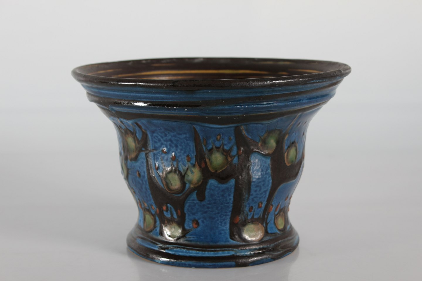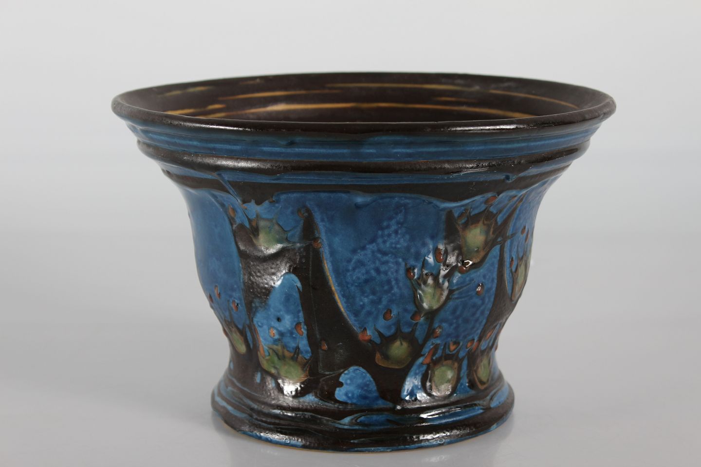 Herman A. Kähler Flowerpot with dark blue, green, black and rust red glaze Sign. HAK + Danmark Height 17 cm Diameter 26 cm Nice vintage condition - see images of small chips
