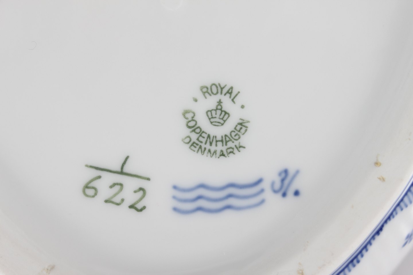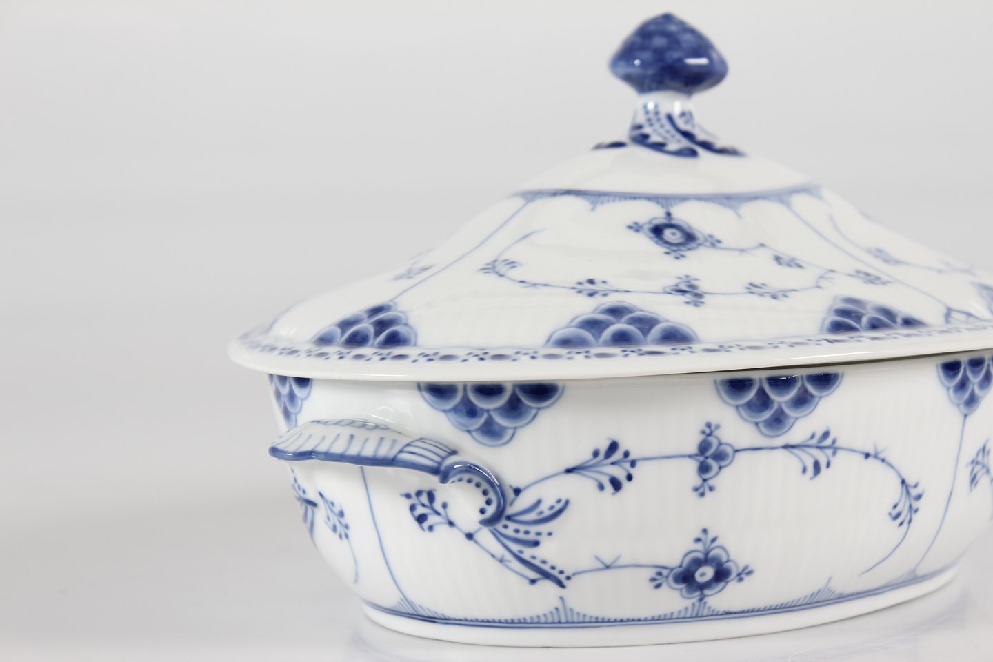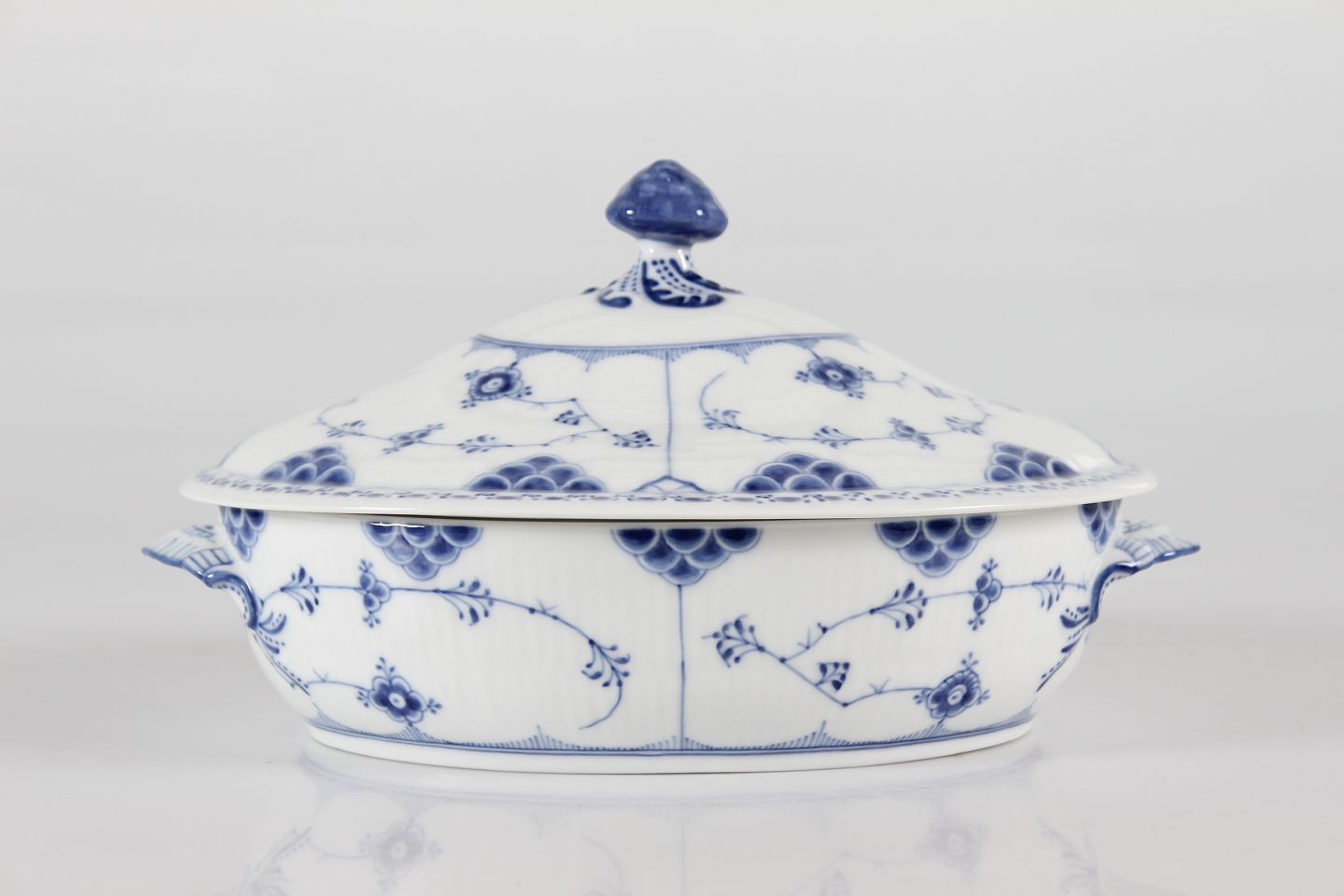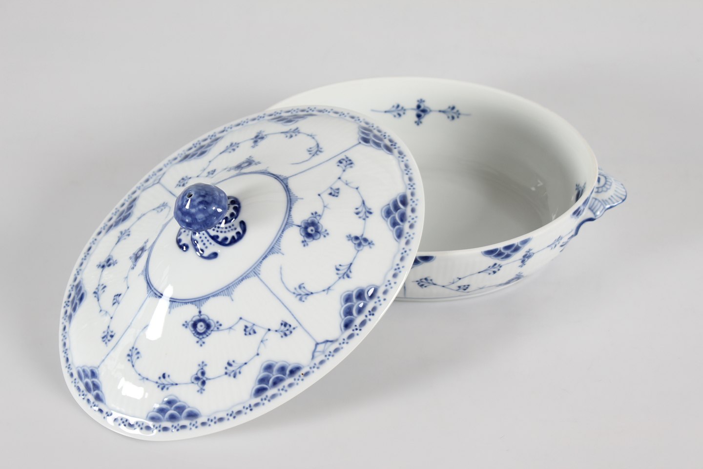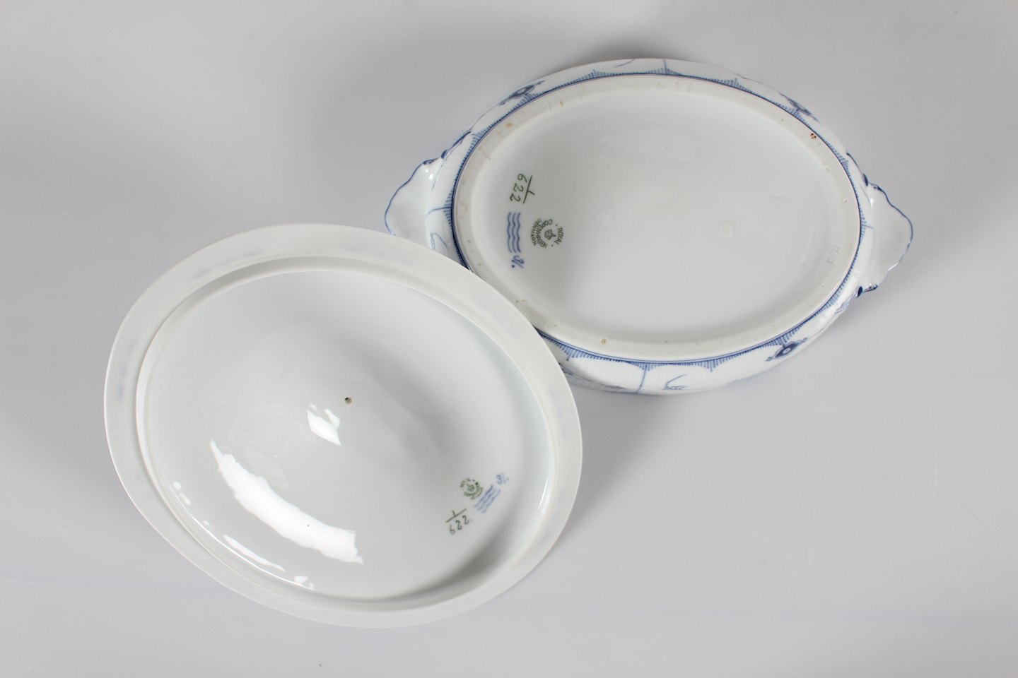Royal Copenhagen Musselmalet Halvblonde Ovalt lågfad/lille terrin nr. 1/622 Med stempel fra perioden 1923-34 Længde 27,5 cm Bredde 19 cm Højde 15 cm Fin fejlfri 1. sortering