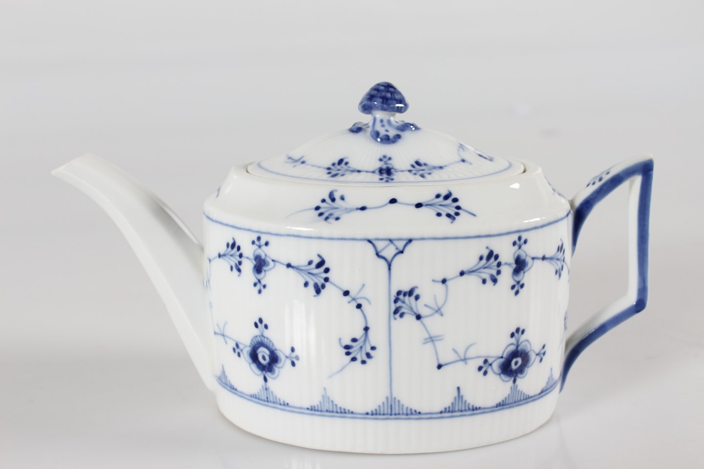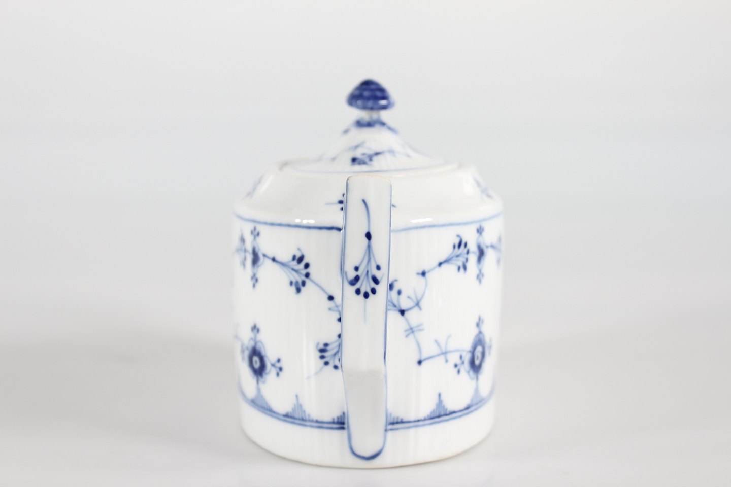 Royal Copenhagen Musselmalet Riflet Antik aflang thekande model 1/254 Med stempel fra perioden 1894-1922 Længde 23 cm Højde 12,5 cm Indeholder: 0,6 L 1. sortering - se billede af lille uregelmæssighed på kanten af låget