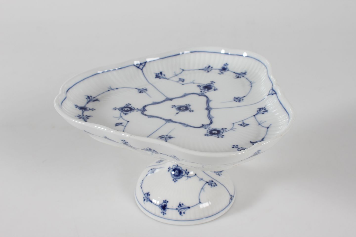 Royal Copenhagen Blue Fluted Plain Triangular cake stand no. 1/19 + 1/27 with stamp from the period 1894-1922 Height 12,5 cm Diameter ca. 22 cm Factory 1. Very nice condition - no chips, cracks or repairs
