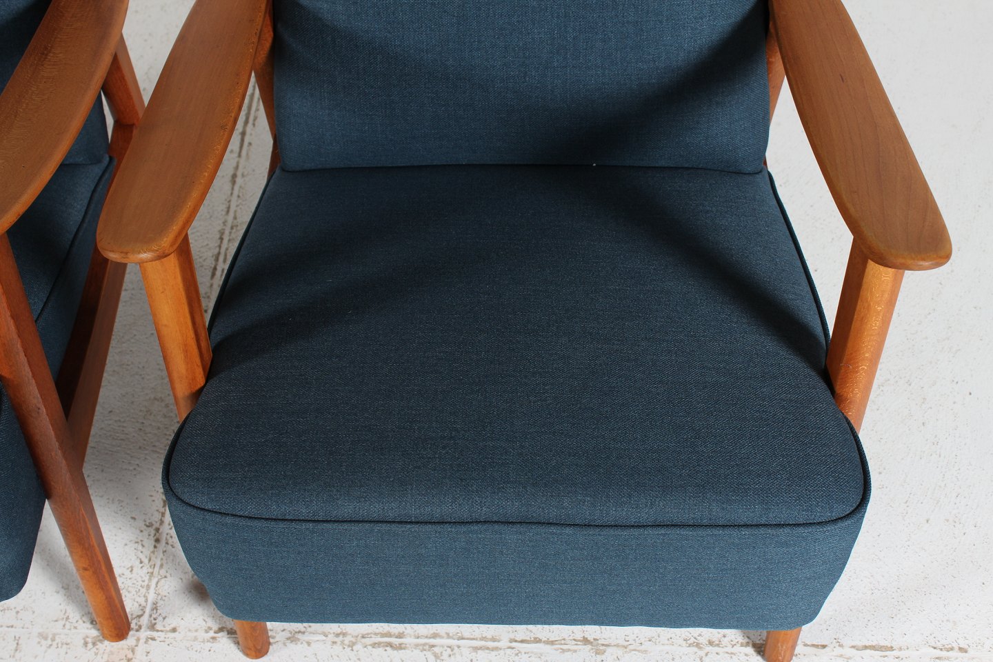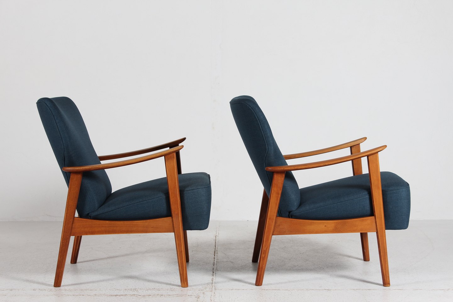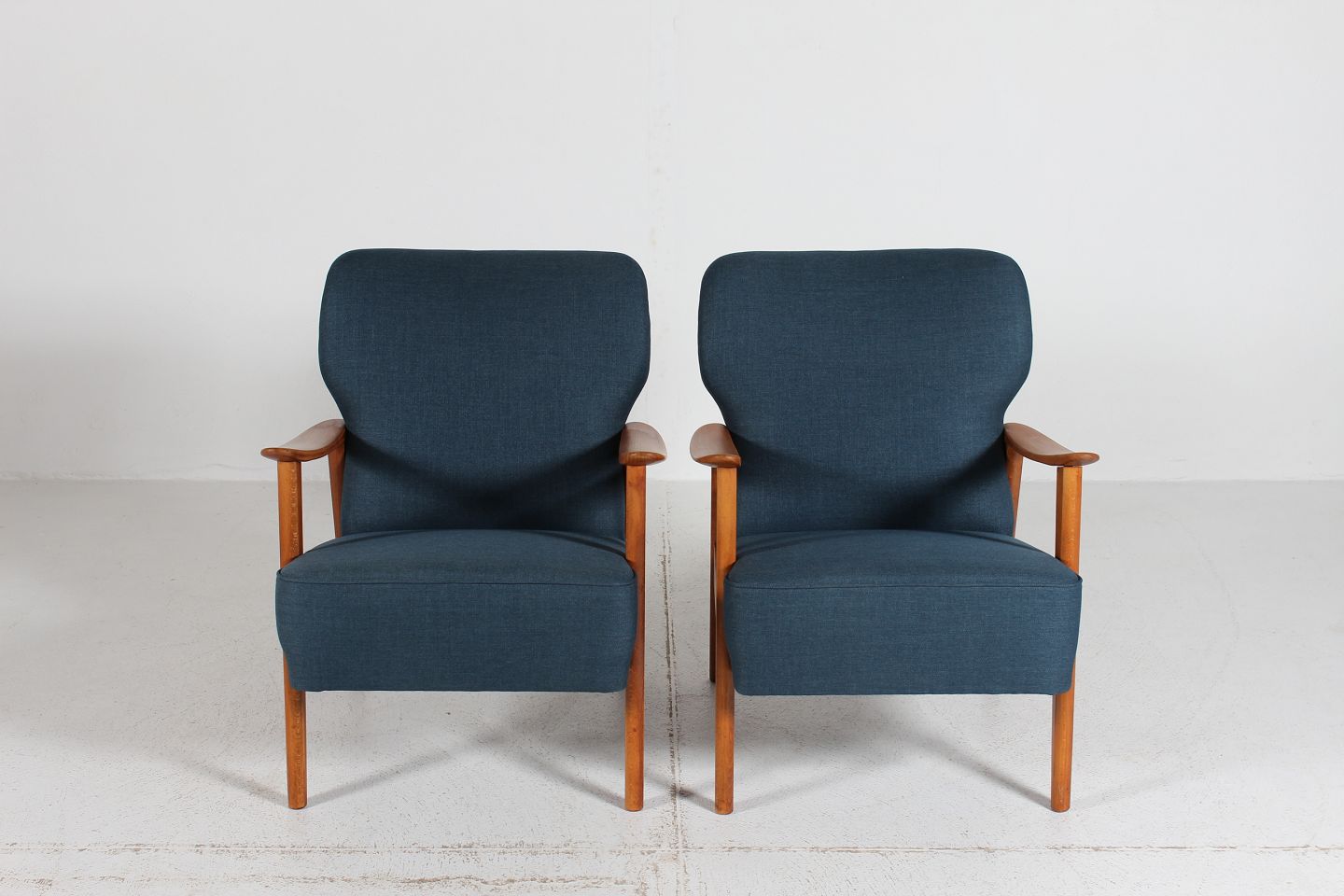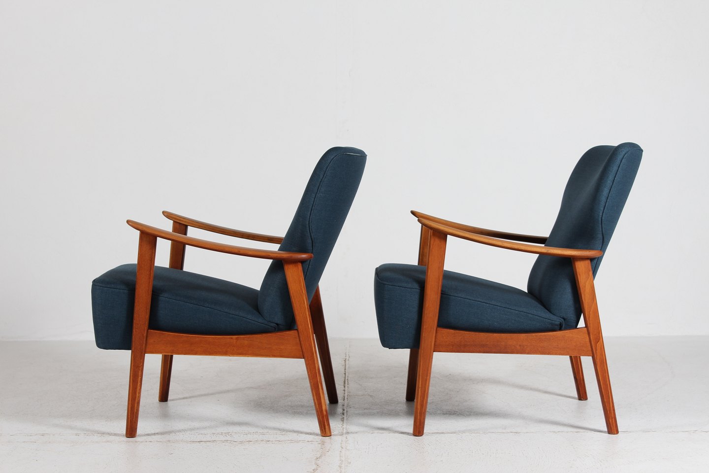 Fritz Hansen A/S Par lænestole af teak farvet bøg betrukket med blåt betræk. Producent: Fritz Hansen A/S Mål: Højde 83/46 cm Bredde 66 cm Dybde 82 cm Fin stand med nyere betræk og god fasthed