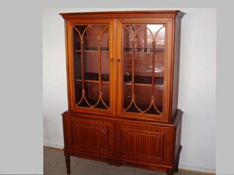 Glas vitrine , Øverst med 3 hylder, 2 låger herunder 2 skuffer til bestik