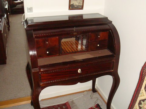 med cylender klap og 4 små skuffer med elfenbens knupper og spejl i midt , udtræks bord over stor skuffe