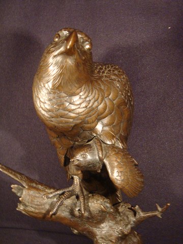 Figure in bronze. Sparrowhawk on tree root in bronze which has its prey in the left claw.