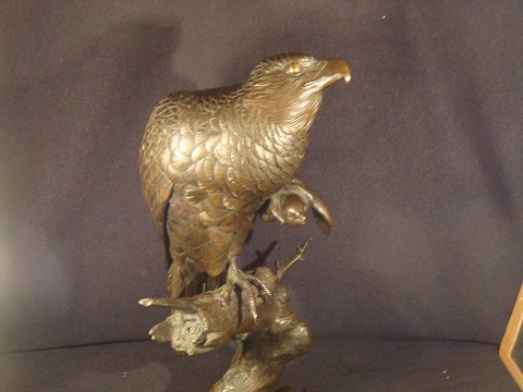 Figure in bronze. Sparrowhawk on tree root in bronze which has its prey in the left claw.