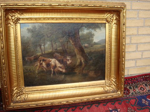 Old English Painting in Beautiful Frame Cows graze in the forest. while the shepherd sleeps under the tree. time calms owned by Shiels schelchau Mark. (kollerup Gods).