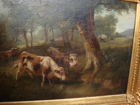 Køer Græsser i skovbrynet. mens hyrden sover under træet.'