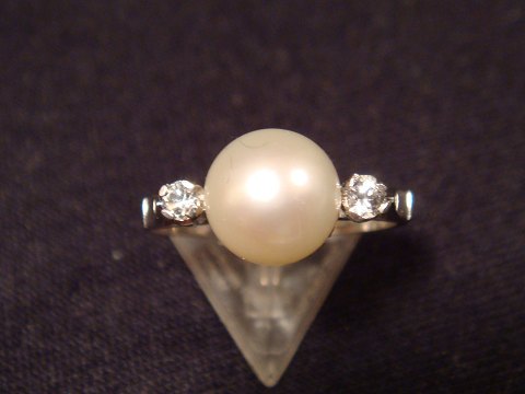 Ring med Saltvands perle. siderne prydet med to Diamant slebet krystal.