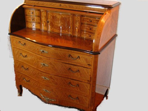 Cylinderformet klap bag 6 skuffer , 2 hemmelige skuffer , 1 låge med støre rum bag ved, og udtrækkelig skriveplade.