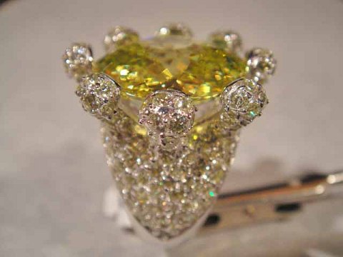 Ring. with Large Yellow crystal, the sides lined with numerous cut crystals.