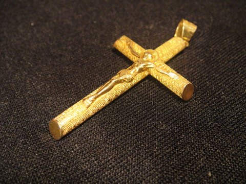 Appendage. Cross. with the crucified Jesus on one side.Guld 18k 750.Længde: 5 cm, width 2.5 m