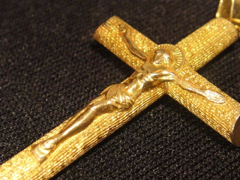 Appendage. Cross. with the crucified Jesus on one side.Guld 18k 750.Længde: 5 cm, width 2.5 m
