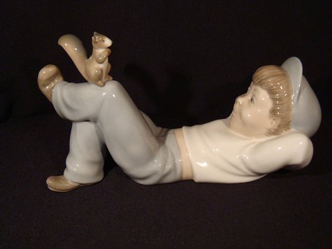 Figur. Dreng ligger på ryggen og ser på egern. Spansk figur Zaphin. Flot og pæn stand.