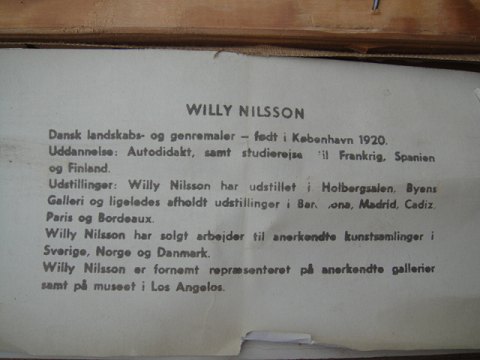Exhibitions: Willy Nilsson has exhibited in Holbergaalen. The city's gallery and also held exhibitions in Barsalona, Madrid, Paris and Cadiz Bordeaux.Willy Nilsson has sold work to the renowned art collections in Sweden, Norway and Danmark.Willy Nielsson is well represented in prestigious galleries and Museum in Los Angelas.