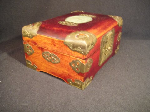 Træ med udsmykninger i messing og udskåret fedtsten i låget.