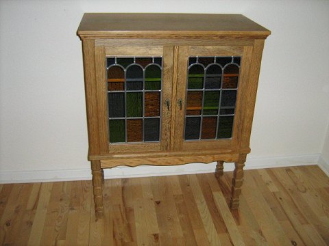 vitrine skab med blyinfattede ruder.