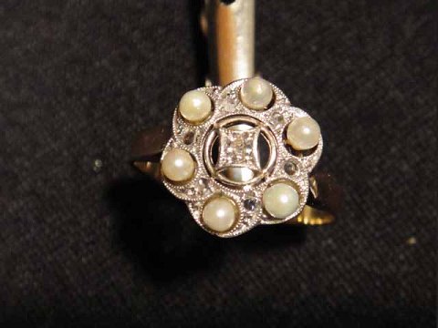 Rosetring. 6 pcs SOUTH SEA beads between each pearl is a diamond. the center is adorned with the diamond. The ring is from about year. 1930 Traces polished and beautiful. Ring Size 56