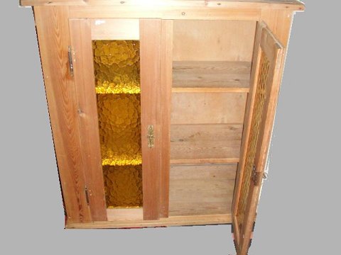 Fyrtræs vitrine. med gult glas. H: 111 cm. B: 101 cm. D: 40 cm.