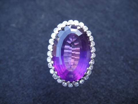 Rosetring. 14k White Gold 585 Great Amatyst surrounded by 28 diamonds. Amatyst about 5 ct. brill: 28 x 0.015 = 0.42 ct Critics length: 23 mm Width: 17 mm Ring size: 55 The ring is polished and beautiful