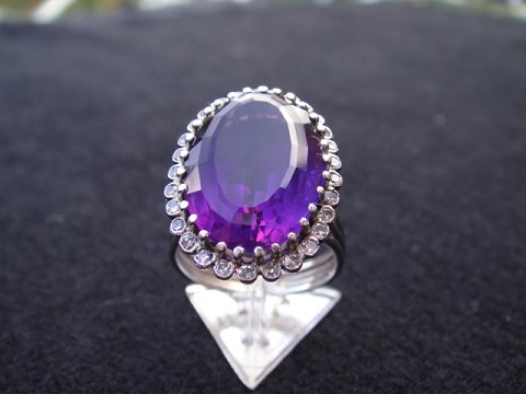 Rosetring. 14k White Gold 585 Great Amatyst surrounded by 28 diamonds. Amatyst about 5 ct. brill: 28 x 0.015 = 0.42 ct Critics length: 23 mm Width: 17 mm Ring size: 55 The ring is polished and beautiful