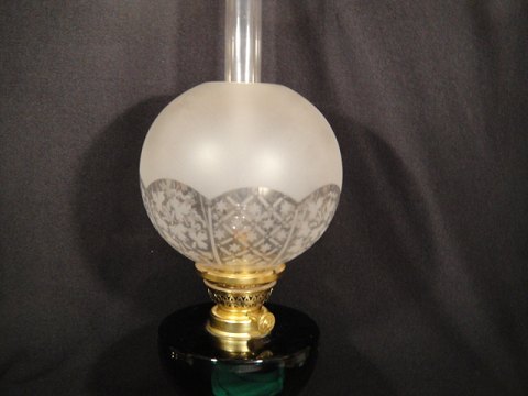 Paraffin lamp in green glass. Height with flue pipe 41 cm. Contact for price