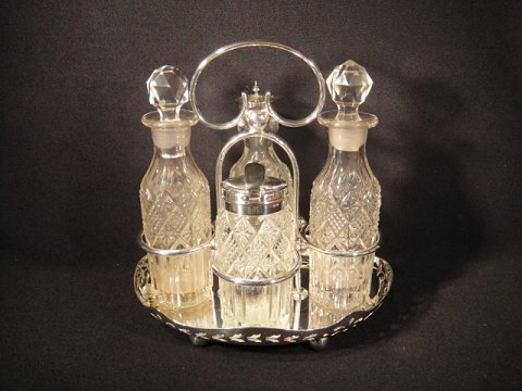 Plat de menage med sennep, salt,Olie og Eddike flaconer.