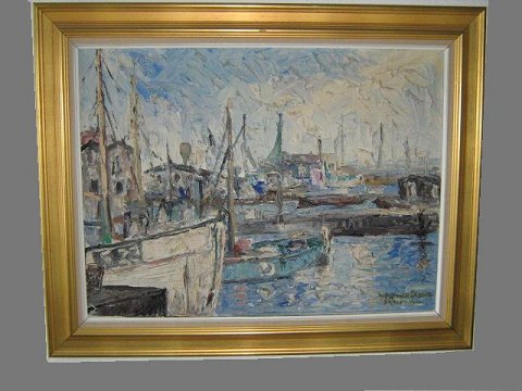 Painting of Fishing Boats in the harbor. Skagen Harbour. Signed Verner Larsen.
