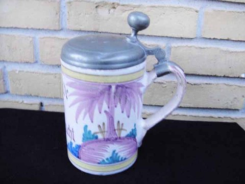 Kellinghusen mug with tin lid. (copy) However, this made ​​at another German factory in 1800. Height 22 cm. Diameter: 11 cm.I city Kellinghusen there was a faience from the year 1764 to 1860som was very famous for its earthenware Talerkner, mugs, dishes mm.Her is a lovely mug but with hairline crack in view photos. from another German factory which mimicked Kellinghusen. but in good condition.