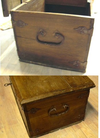 Gl. Egetræs kiste med jernbeslag, orignal lås og nøgle. flad låg meget pæn stand