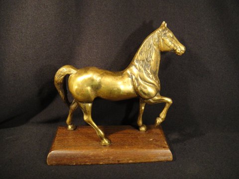Bronze hest på træstander. Højde: 22 cm , Bredde: 10 cm. , Længde: 20 cm