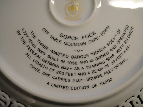 motiv Full-Rigged " Gorch Fock (ll) " ,Vesttyskland. er nr. 4 i en serie af 6 stk. windjammer Tallerkner / platte. nr. 8869 /633 Fremstillet af Bing & Grøndahl.