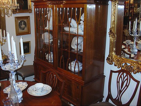 Hepplewhith Spisestue fra farre møbelfabrik Bord, 2 plader, Anretterbord, Glasvitrine 8 stole