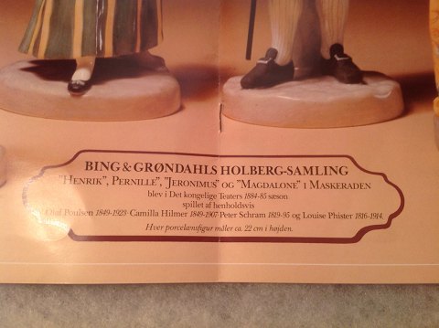 Die Figuren "Jerome" Masquerade Theatersaison 1884blev von Peter Schram Geboren 1895 Gestorben 1895 spielte Nie zuvor hat es gemacht worden, dass die ausschließliche dänischen Sammler-Serie. für alte Modelle Bing & Gröndahl erstellt vier einzigartigen Figuren von Akteuren aus dem Theatre Royal in ihren Rollen als "Henry", "Pernille", "Jerome" und "Lone Magda" in der Komödie "Maskerade". Mit der größten Genauigkeit reproduziert Spieler und ihre Kostüme so wie sie hätten auf der 200-Jahr-Jubiläums-Show im Jahr 1884 im Nationaltheater zu sehen. Es gibt umfangreiche Studien und eine große, raubHandArbeit hinter jeder Figur in Holberg Treffen. Daher gab es nur 500 Sätze hergestellt. Jede Figur in Holberg-Kollektion kommt mit einem Zertifikat in einer festen Box aus poliertem Mahagoni nummeriert. , die mit dunkelblauen velour.