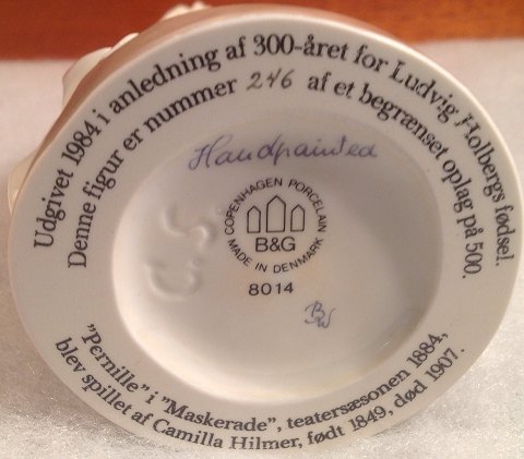 The figure "Pernille" Masquerade theater season in 1884 was played by Camilla Hilmer 1849 died 1907 Never before has there been made that exclusive Danish collector series. for old models have Bing & Grondahl created four unique figures of actors from the Theatre Royal in their roles as "Henry", "Pernille", "Jerome" and "Magda Lone" in the comedy "Masquerade". With the greatest accuracy reproduced players and their costumes just as they could be seen at the 200-year anniversary show in 1884 at nationalscenen.Der are extensive studies and a large, consuming handwork behind every figure in Holberg samlingen.Derfor have only been manufactured 500 sets . Each figure in Holberg collection comes numbered with a certificate in a solid box of polished mahogany. which is lined with velvet dark blue. B & G no 8014