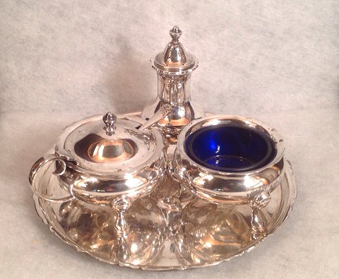 Bestående af Sennepskål med blå glas , Saltskål med blå glas, peberbøsse. samt BAKKE.
