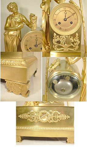 Fransk Lueforgyldt Empire kaminur af bronce, rigt støbt med bladværk, ved siden af urhus figur i form af kvinde som holder maske , urskive med romertal.19 årh