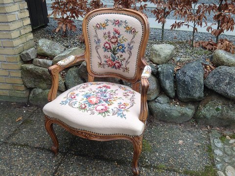Rococo stol. Lavet i nøddetræ med broderet betræk Fremstår flot og velholdt.