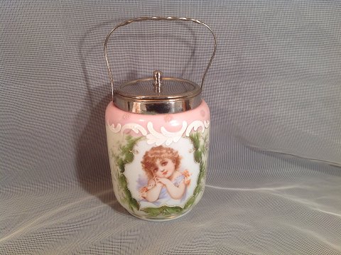 Kiksespand / bisquitdåse , Opalhvid gas som sjanser fra hvid over i Lys grøn og top i Lyserød, blæst, afsprængt munding, På brændt dekoration i emalje, monteret med metalbeslag. kontur med håndmalet blomster i emalje og blade og lille bedårende pige.