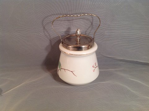 Kiksespand / bisquitdåse , Opalhvid gas, blæst, afsprængt munding, På brændt dekoration i emalje, monteret med metalbeslag. kontur med håndmalet blomster og blade. Under bunden nummer 2284/235