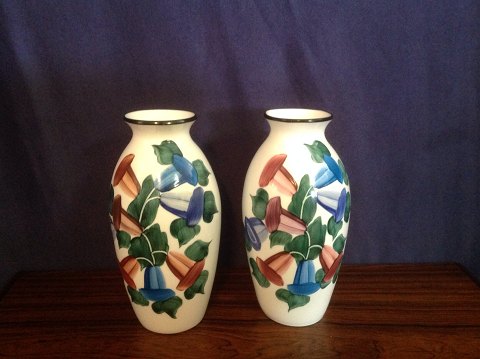 2 stk. Mundblæste Opaline glasvaser. Med bemalet trompet blomster. højde: 18 cm.