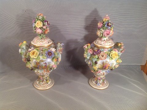 1 stk. Pryd Vaser af porcelæn og hanke. Dekoreret med guld, små kærlighedsmotiver, og pousserede blomster. Potschappel, Tyskland, 19./20. århundrede. Højde: 27 cm. Fremstår med afslag i blomster.