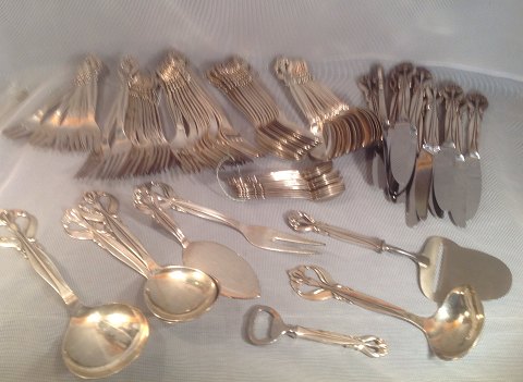 12 stk. Middagsknive. 12 stk. Middagsgaffel. 12. stk spiseske. 12 stk. Dessertske. 12 stk. Kagegaffel. 12 stk. kaffeske. 1stk. Stegegaffel. 12 stk. Frokostgaffel. 1 stk Sovseske. 1 stk. Ostehøvl. 1 stk. kompotske. 1 stk. kartoffelske. 1 stk. Oplukker.