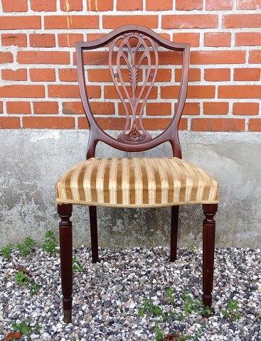 5 stk. stole af mahogni med messing sko, skjold formet ryg med udskæringer, på tilspidsede forben.