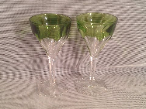 Meget smukke rinskvinglas med facetteret grøn kumme på facetsleben høj slank stilk og sekskantet fod.