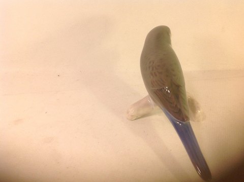 Green budgie with blue tail feathers.