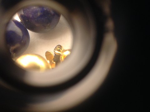 Lapis lazuli halskæde, i forløb med blankpolerede lapis lazuli perler, kuglelås af guld 14 kt. Længde: ca. 45 cm. Perlediam. lapis lazuli perler fra Ø 4 mm til 11,5 mm. Mål lås Ø 8 mm.