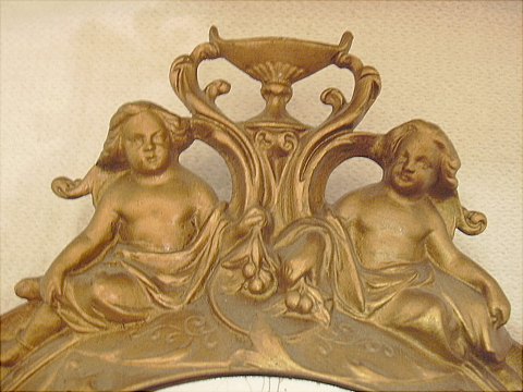 Vægur med hvid emalje skive oven på prydet med to putti mangler en lille detalje for neden