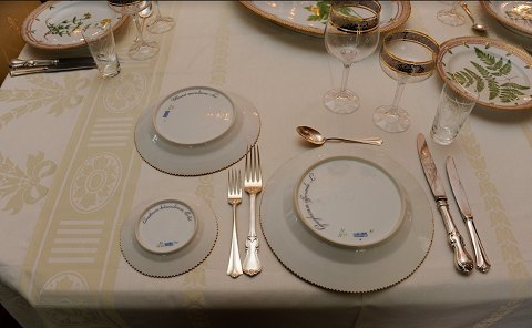 Flora Danica. Prinsesse Dagmars middagsservice af porcelæn dekoreret i farver og guld, bestående af: 12 middagstallerkener med forskellige blomster bl.a. 'Galeopsis Laudanum.L.' og 'Heleosciadium repens. Koch.', no. 3549, Ø ca. 25,3 cm, tre med hver et lille skår, 12 frokosttallerkener med forskellige blomster bl.a. 'Pulsatilla vulgaris Lob.' og 'Lathyrus silvestris. L.', no. 3550, Ø ca. 22,2 cm, seks med små skår samt en med hårrevne, stort ovalt fad med 'Trollius europæus.L.', no. 3519, L. 45 cm, stort ovalt fad med 'Carduus nutans.L.', no. 3519, L. 44,8 cm, kant med lille skår, 11 asietter med bl.a. 'Polygala depressum. L.' og ' Cerastium tetrandrum. Curtis.', no. 3552, Ø 14,2 cm, fem med små skår, oval skål med 'Lysimachia vulgaris. L.', no. 3506, L. 24,5 cm, lille tresidet skål med hank med 'Lonicera floribunda. L.', no. 3544, L. 21 cm, med to små skår og repareret hank, to ovale saucekander på underfade med grenhanke og pousserede blomster med bl.a. 'Fumaris micrantha. Lag.', no. 3556, L. ca. 24 cm, lille tresidet skål med låg og underfad med grenhank og pousserede blomster 'Viola tricolor L. d. arenaria. Sond.', no. 3575, H. 9 cm, stort ovalt lågfad med grenhanke og poussere blomster med 'Lavatera thuringiaca. L.', no. 3567, H. 18 L. 40 cm. Proveniens: Gave fra danske kvinder til prinsesse Dagmars (1890-1961) bryllup med Hofjægermester Jørgen Castenskiold (1893-1978) den 22.1.1922. Prinsesse Dagmar var datter af kong Frederik VIII (1843-1912) og dronning Lovisa (1851-1926) og var opkaldt efter sin faster og gudmor, kejserinde Dagmar (Marie Feodorowna) (1847-1928) af Rusland. Afbildet: Artikel om Herregården 'Kongstedlund' med interieurfotografier med prinsesse Dagmar og Jørgen Castenskiold, Dansk Familieblad 17. april 1962.
