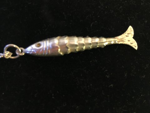 Vedhæng i form af fisk med bøjelig led ved krop og hale.