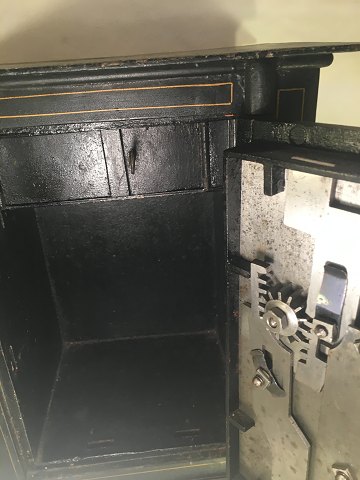 Old unique safe in miniature. standing on wooden shelf. with 2 drawers.